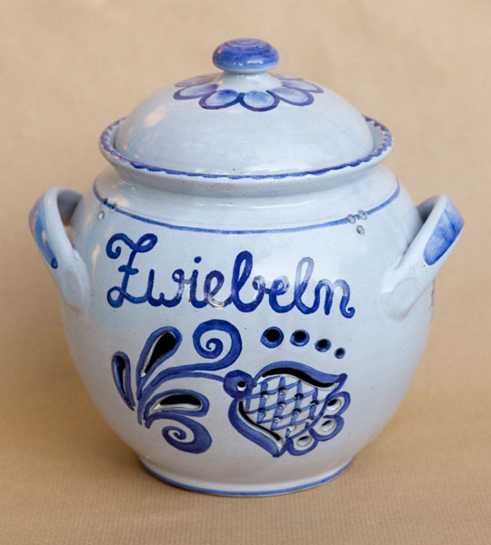 Zwiebeltopf aus Keramik Standardgröße, für reichlich 1 kg Zwiebeln, ausgeschnittene Ornamente, einseitig beschriftet, versch. Größen Zwiebeltopf